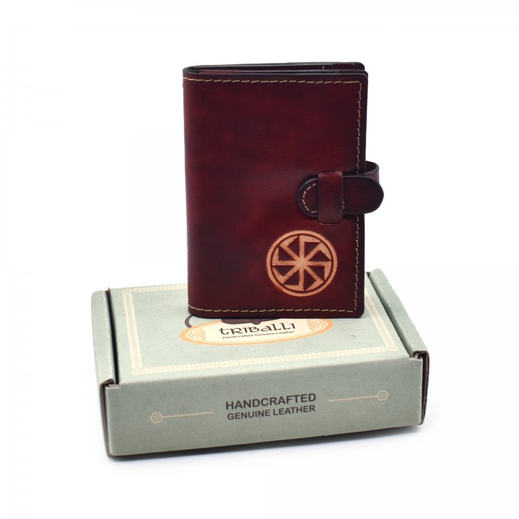 Novčanik prikazan na slici služi za čuvanje do 6 kreditnih kartica ili kartica istih karakteristika, kao što je nova lična karta, nova vozačka, razne članske kartice i sl. Novčanik je u celosti izrađen od ručno bojene kože - goveđeg vrata. Na novčanik je tehnikom hladnog otiska otisnut simbol Kolovrat i nakon toga novčanik je ofarban ručno.