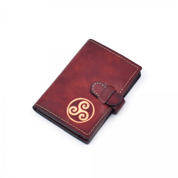 Novčanik prikazan na slici služi za čuvanje do 6 kreditnih kartica ili kartica istih karakteristika, kao što je nova lična karta, nova vozačka, razne članske kartice i sl. Novčanik je u celosti izrađen od ručno bojene kože - goveđeg vrata. Na novčanik je tehnikom hladnog otiska otisnut simbol Triskelion i nakon toga novčanik je ofarban ručno.