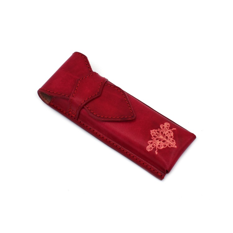 koja je gravirana i ručno farbana transparentnom crvenom bojom za kožu.