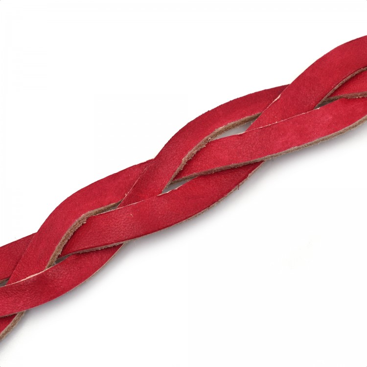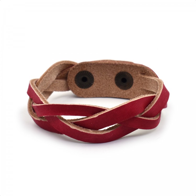 Ova narukvica je u celini izrađena od prirodne kože - goveđeg vrata, koji je ručno upleten i ručno farban prirodnim netoksičnim bojama za kožu. Pored crvene boje, u mogućnosti smo ponuditi Vam ovu narukvicu u antilop (maslinasto zelena), narandžastoj, zelenoj, bordo i kesten braon boji.